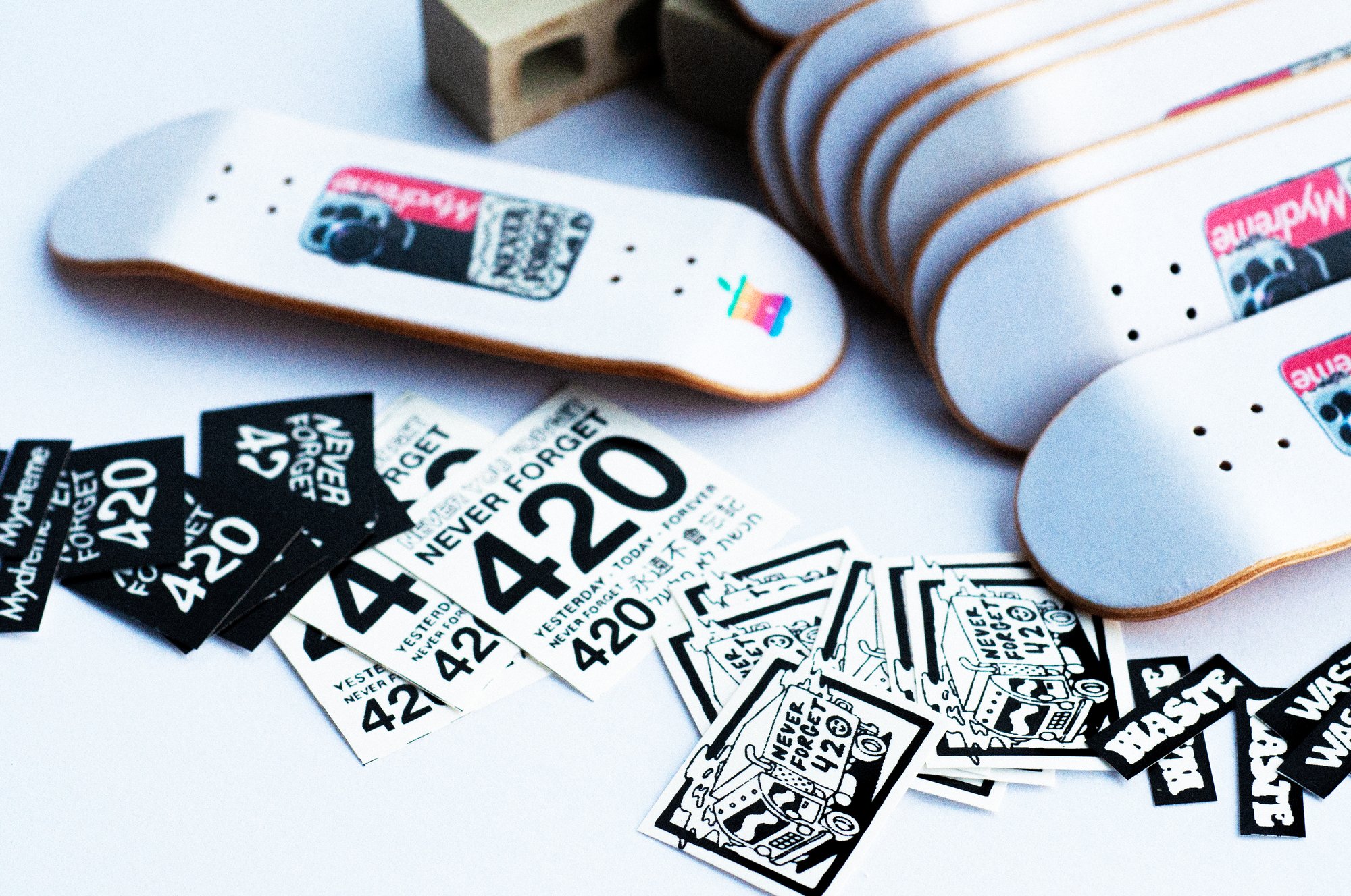 Including exclusive miniature screen printed NF420 vinyl stickers, mini Waste stickers, as well as one or more full size NF420 sticker(some eggshell some vinyl). Also a slice of the generic grip with the white backing.